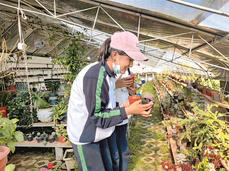圖為(wei) 在青少年實踐基地,學生正在欣賞自己親(qin) 手種植的多肉植物。 拉薩融媒記者 餘(yu) 洋洋攝