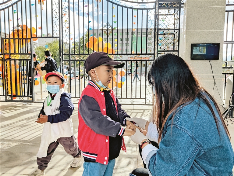 圖為(wei) 在拉薩江蘇實驗幼兒(er) 園門口,老師對入園幼兒(er) 進行手部檢查。拉薩融媒記者 餘(yu) 洋洋攝