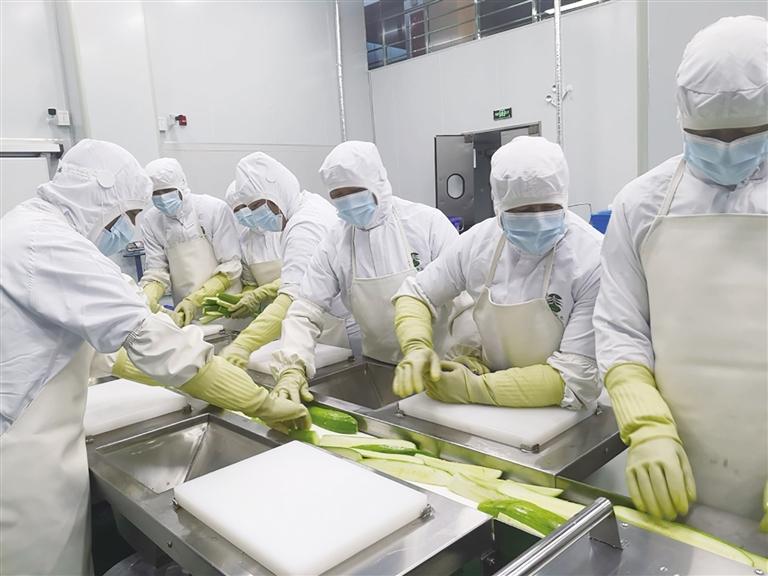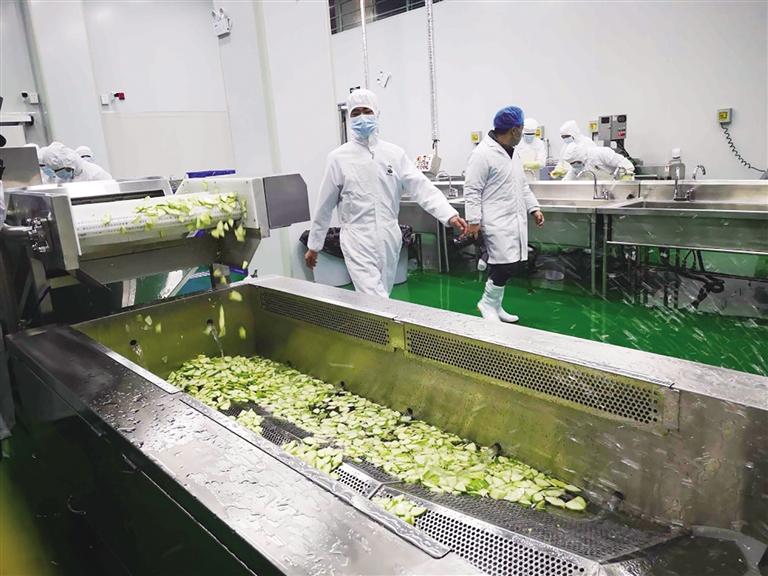 隨後,記者來到了素菜初加工車間,這裏有很多設備,洗淨的一筐青筍條通過其中一個(ge) 小設備後,兩(liang) 分鍾全部變成了青筍丁,洗淨的菜瓜通過一條切片的生產(chan) 線後立即變成了小的塊狀,經過保食安專(zhuan) 業(ye) 食品淨化工業(ye) 機後,直接回收到盛菜的框裏。在葷菜初加工車間,工作人員把雞蛋放入水池中消毒清洗,將洗淨的雞脯肉放入切丁機中進行分切,一兩(liang) 分鍾雞脯肉就變成了肉丁。