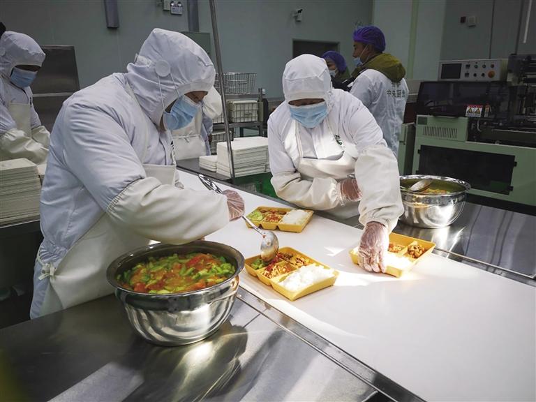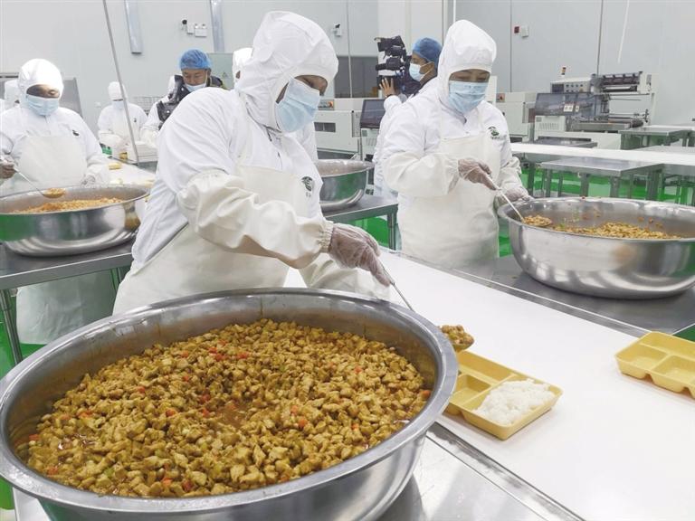 這些淨菜準備好後,通過設備轉運至熱菜烹炒車間,在這裏有幾位廚師正在烹飪宮保雞丁、西紅柿炒蛋、青菜西紅柿湯等。這些淨菜經過加工之後被運送至分餐車間。餐盒經高溫消毒後,工作人員將每一份米飯、熱菜取樣留存,然後開始分工分餐,打包好的餐盒通過加溫消毒後,裝進保溫箱,運送至配餐車內(nei) 。