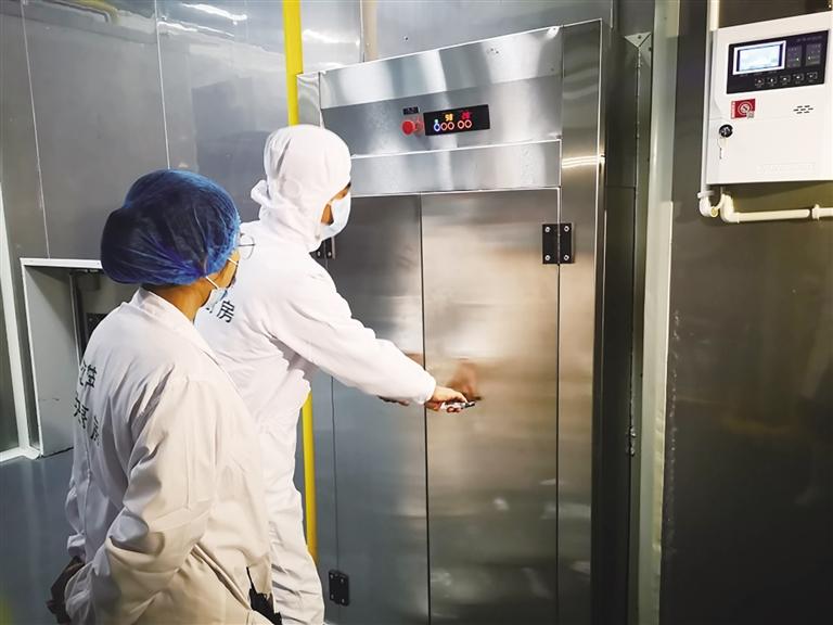 通過員工通道,在該廚房生產(chan) 廠長甘文忠的指導下,記者穿上了白色工作服、戴上食品安全帽,換上高筒膠鞋,洗手消毒、測量體(ti) 溫、隨身攜帶的手機、首飾全部摘掉後,通過腳踏池進入生產(chan) 加工車間。