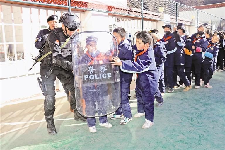 圖為(wei) 比如縣公安局民警正在為(wei) 比如縣第三小學五年級的學生講解警用盾牌的使用方法。記者 萬(wan) 靖 攝