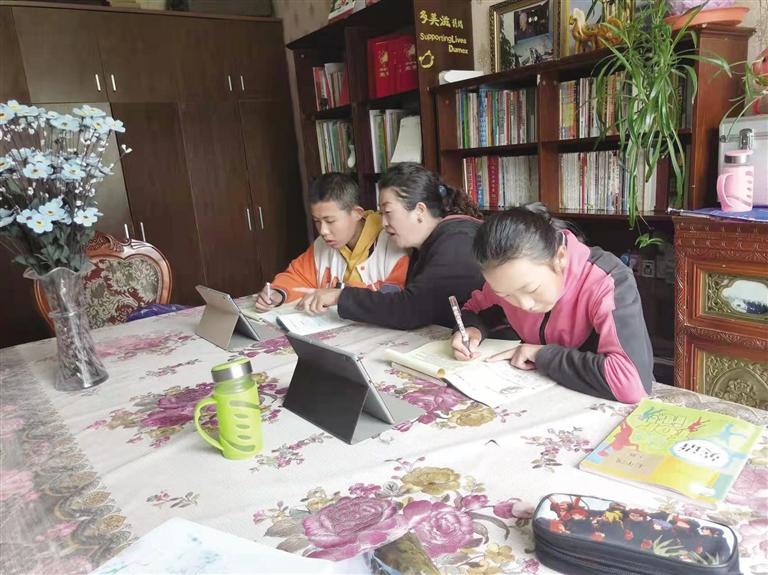中國拉薩SOS兒(er) 童村的媽媽為(wei) 孩子輔導作業(ye) 。記者 王靜 攝