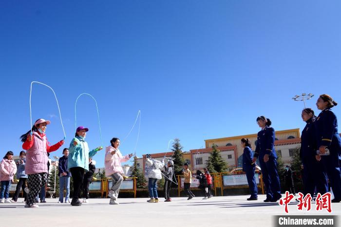 圖為(wei) 誌願者和孩子們(men) 開展跳繩遊戲。 施福壽 攝
