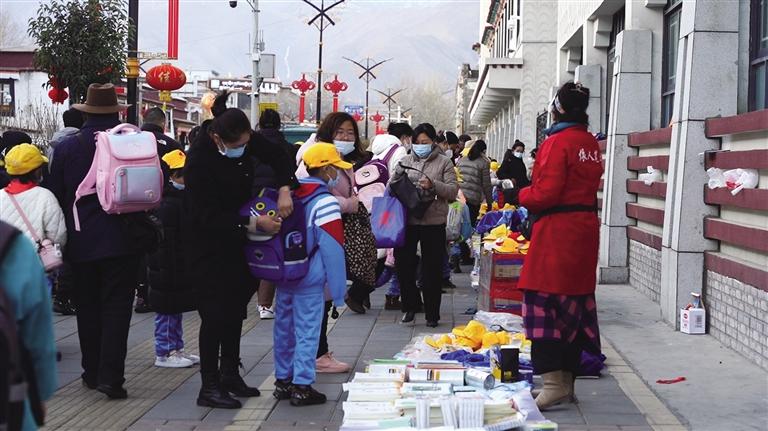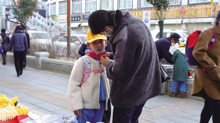 10日早上8時20分許,小學生們(men) 佩戴鮮豔的紅領巾、頭戴小黃帽,陸陸續續走進拉薩市第一小學的校門。今年春季開學第一天,有些家長蹲在孩子麵前,幫忙整理衣帽,同時鼓勵孩子“加油!”。