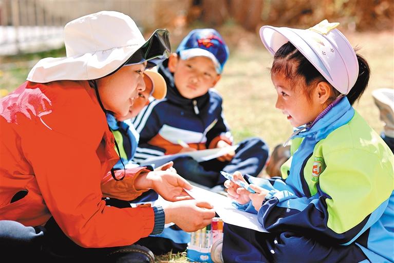 圖為(wei) 幼兒(er) 園老師在教孩子們(men) 繪畫。通訊員 倫(lun) 珠澤仁 記者 洛桑 攝