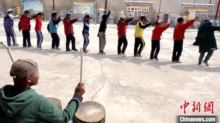 圖為(wei) 多油完小學生在課餘(yu) 時間練習(xi) 傳(chuan) 統非遺舞蹈“嘎爾”舞。 貢桑拉姆 攝