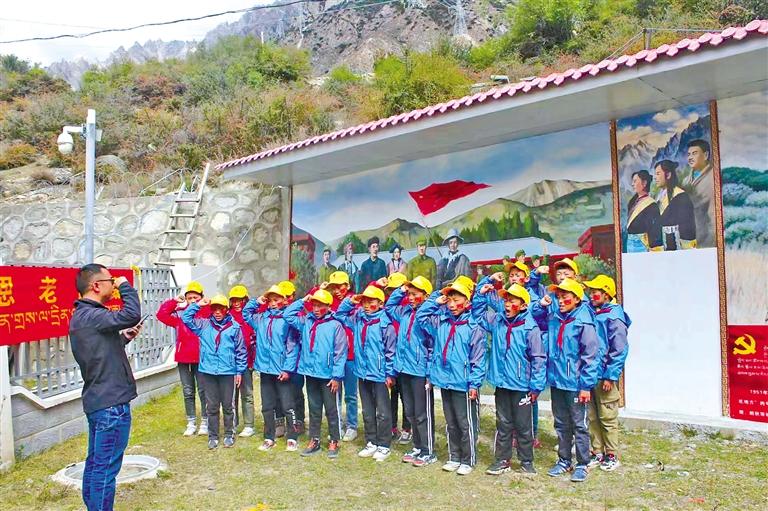 圖為(wei) 鄉(xiang) 黨(dang) 委幹部引領學生在學校“首麵紅牆”旁重溫少先隊員誓詞。記者 索朗瓊珠 次仁片多 攝