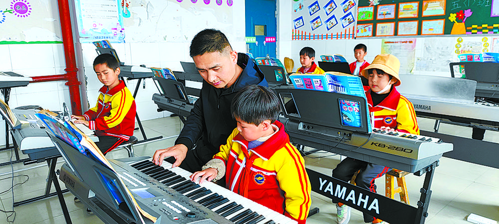 “我會(hui) 教他們(men) 認樂(le) 譜、怎麽(me) 卡節奏、唱什麽(me) 聲部,經過長期堅持學習(xi) ,孩子們(men) 進步很快。”周得彤邊指導學生彈奏電子琴的指法,邊笑著和我們(men) 聊到,自從(cong) 2017年,學校配備了專(zhuan) 門的音樂(le) 教室,每堂課他都會(hui) 堅持使用樂(le) 器,以此來培養(yang) 孩子們(men) 的音樂(le) 素養(yang) ,效果非常不錯。