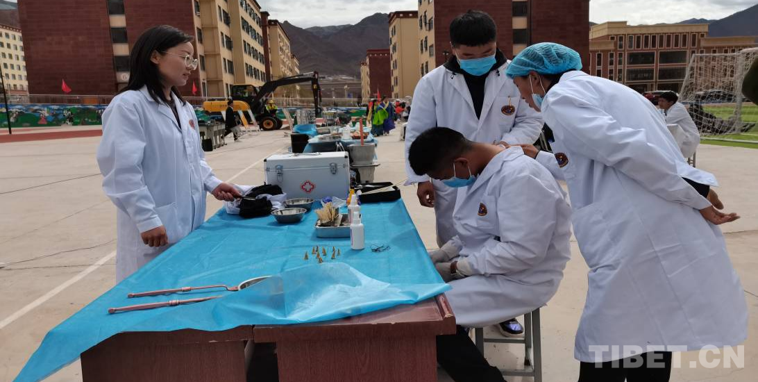 藏醫藏藥專(zhuan) 業(ye) 的同學們(men) 在老師的指導下,有條不紊地進行著火灸,三兩(liang) 個(ge) 同學一起配合,在“患者”頸部選定穴位,點火,看火,直至火焰熄滅,一次火灸時間為(wei) 10至15分鍾。在火灸演示後方,同學們(men) 正展示著藏藥足療,濃鬱的藥草味、熟練的手法盡顯藏醫養(yang) 生療法特色。
