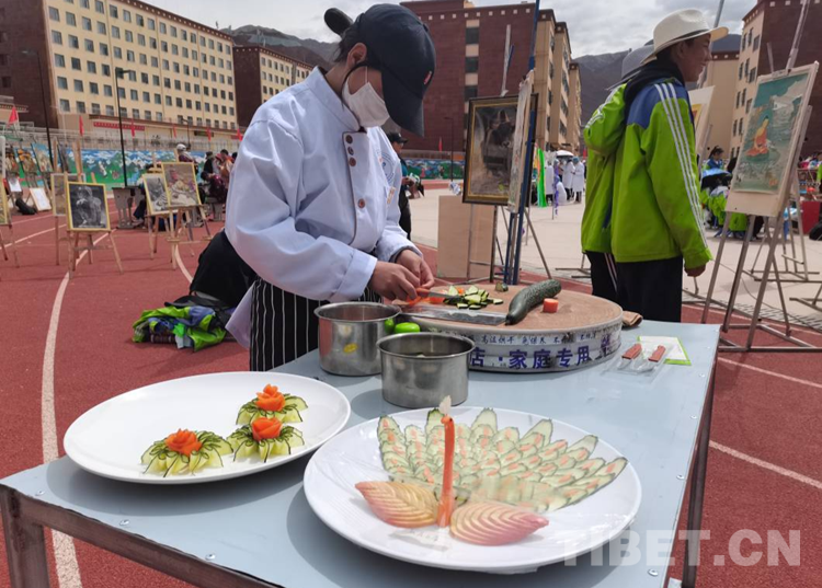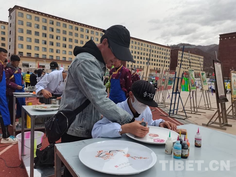 圖為(wei) 烹飪專(zhuan) 業(ye) 教師李建國指導來自丁青縣的洛鬆德青製作果醬畫