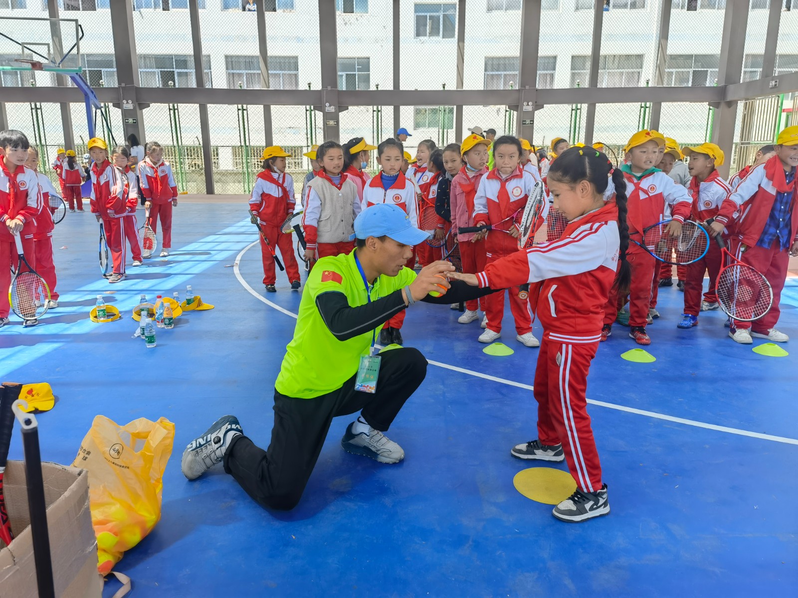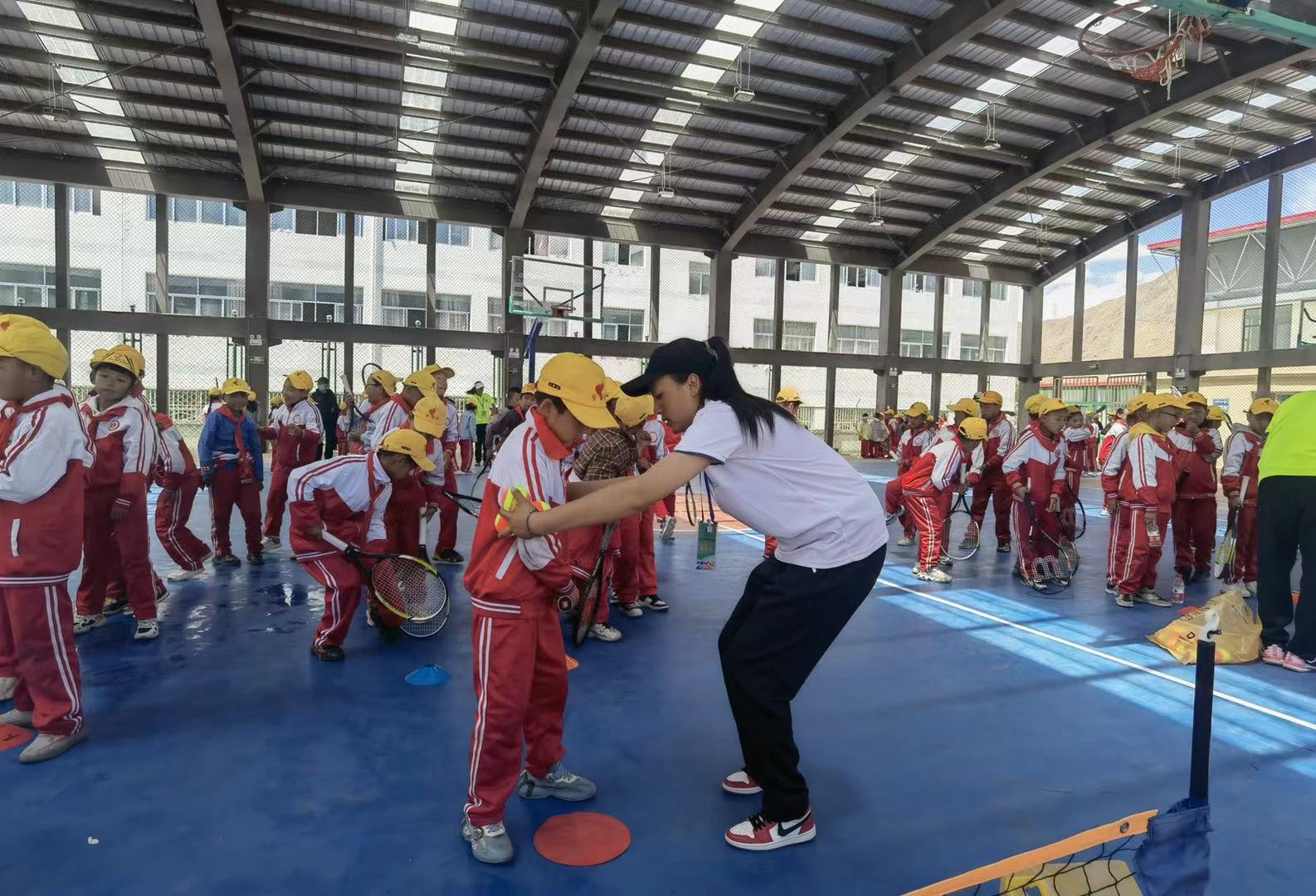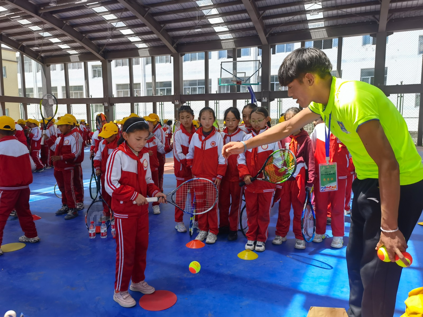 圖為(wei) 西藏自治區網球協會(hui) 向學校師生捐贈網球裝備