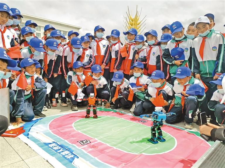 圖為(wei) 啟動儀(yi) 式現場,學生圍觀科技產(chan) 品“機器人跳舞”的場景。記者 紮西頓珠 攝