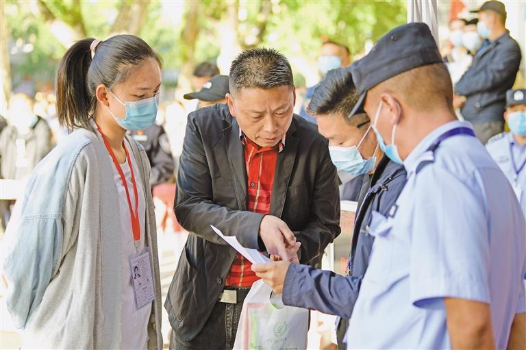 圖為(wei) 拉薩中學考點門前,民警正在為(wei) 考生家長提供幫助。記者 唐斌 攝