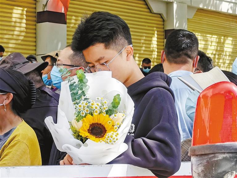 圖為(wei) 家長手捧向日葵在考點外等候考生。記者 王莉 攝
