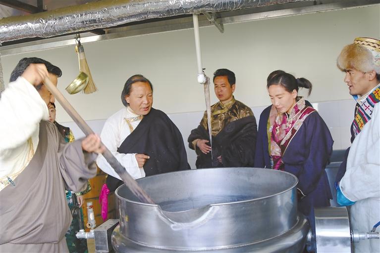 圖為(wei) 國家級非物質文化遺產(chan) 代表性項目——藏醫藥浴法傳(chuan) 承人明珠(左二)指導學生(製藥師)煎熬“五味甘露”。山南市藏醫醫院供圖