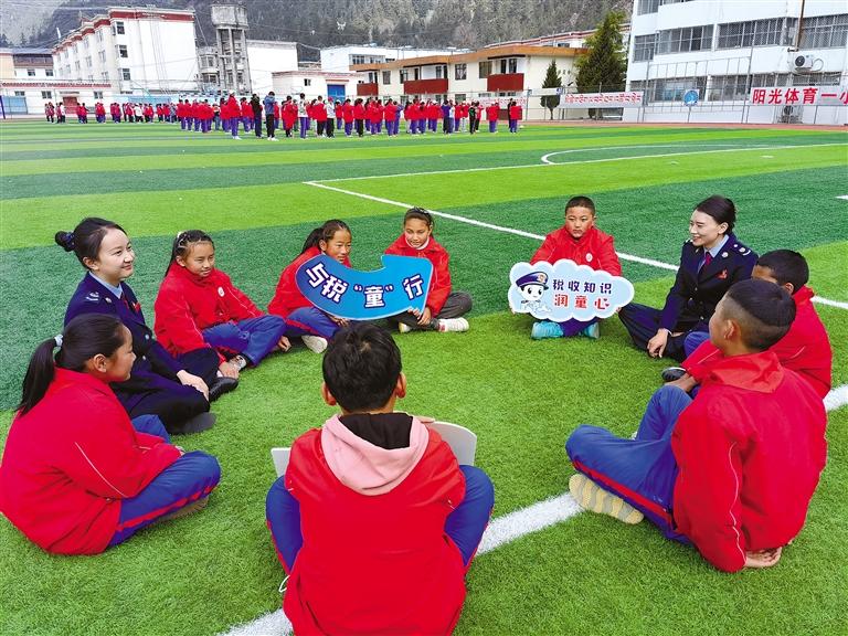圖為(wei) 林芝市稅務局青年黨(dang) 員在波密縣完全小學開展稅法宣傳(chuan) 。記者 張猛 攝