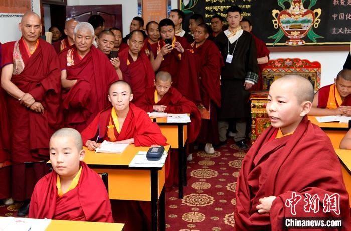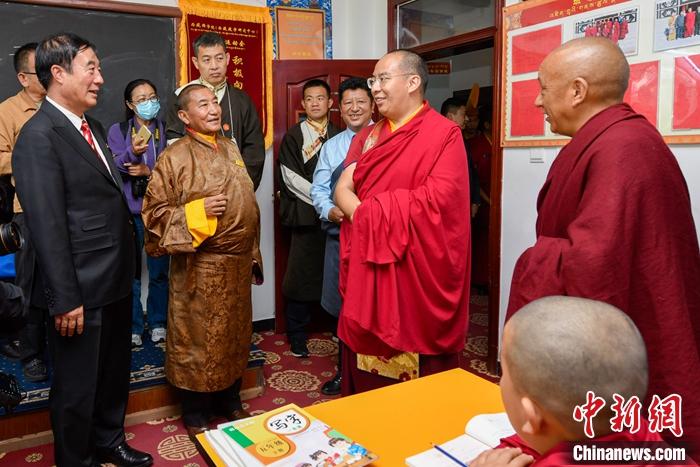 6月16日,班禪來到西藏佛學院少年活佛班,了解少年活佛們(men) 的學習(xi) 、生活情況。中新社發 李林 攝