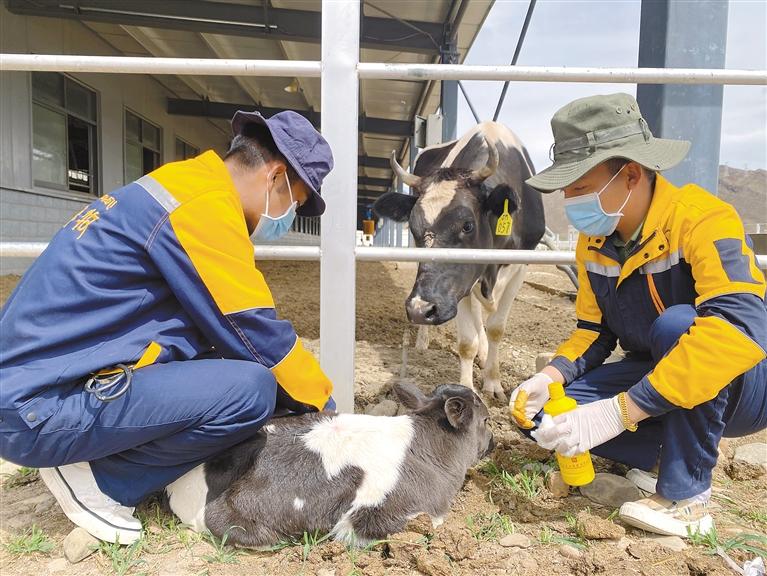 走進格桑塘現代農(nong) 牧產(chan) 業(ye) 示範園,工作人員強久和土旦達傑嫻熟地在給小奶牛的肚臍消毒,這是他們(men) 工作3年時間順利接生的第43頭小奶牛。