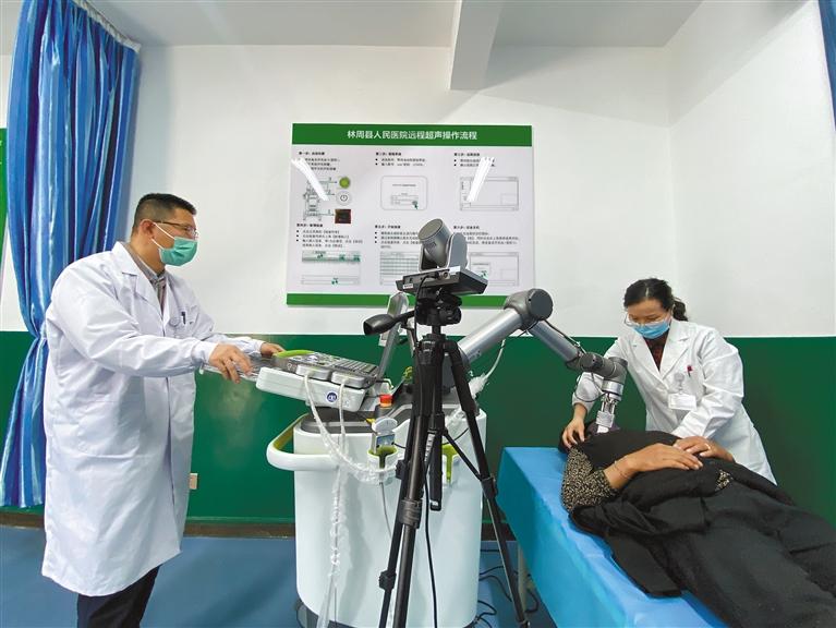 蘇州市援藏工作組引進第一台5G遠程超聲機器人。圖為(wei) 醫生使用遠程超聲機器人為(wei) 患者檢查。