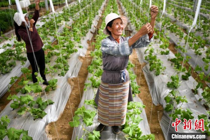 工人在西藏自治區山南市紮囊縣智慧農(nong) 業(ye) 項目的旗雲(yun) 瓜地中勞作。楊華峰 攝
