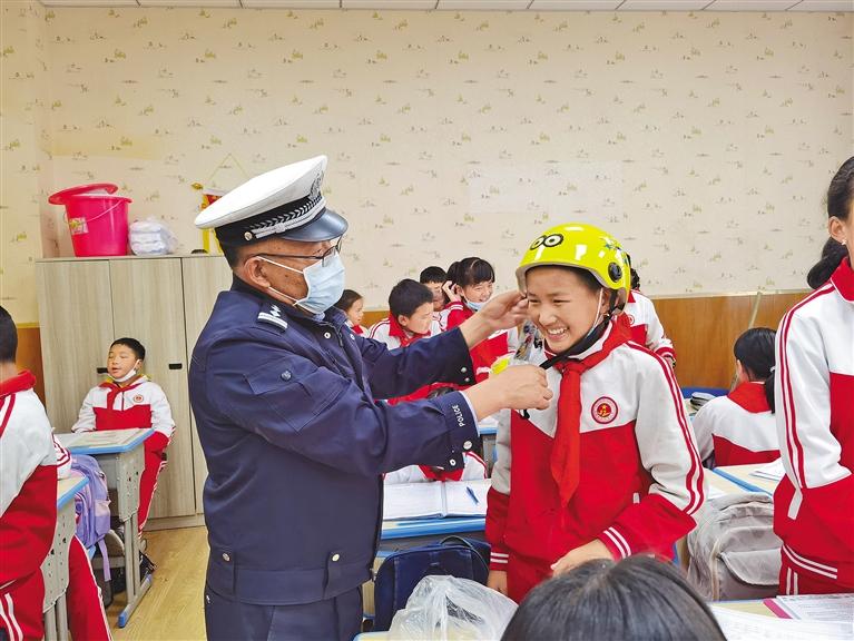 圖為(wei) 民警正在教學生如何正確佩戴安全頭盔。記者 鹿麗(li) 娟 攝
