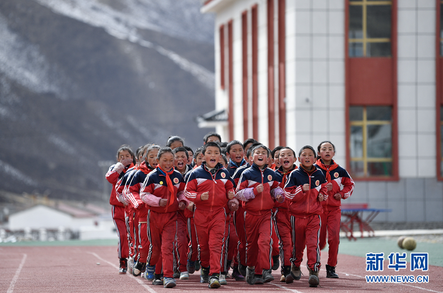在果洛藏族自治州甘德縣下貢麻鄉(xiang) 寄宿製中心小學,學生在上體(ti) 育課。(資料圖)新華社記者 張龍 攝