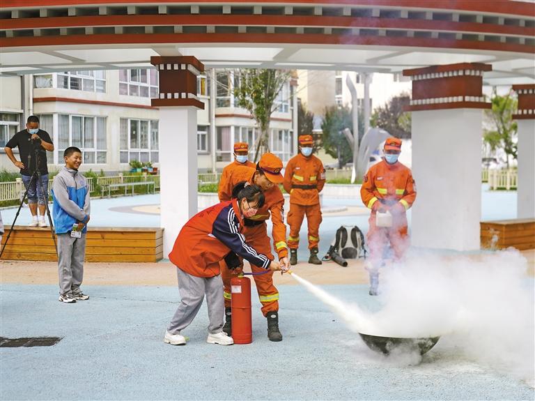 圖為(wei) 消防員教學生使用滅火器。記者 張猛 王珊 謝筱純 攝