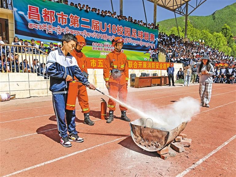 圖為(wei) 在消防員的指導下,學生體(ti) 驗滅火。記者 桑鄧旺姆 通訊員 鄧珠平措 攝