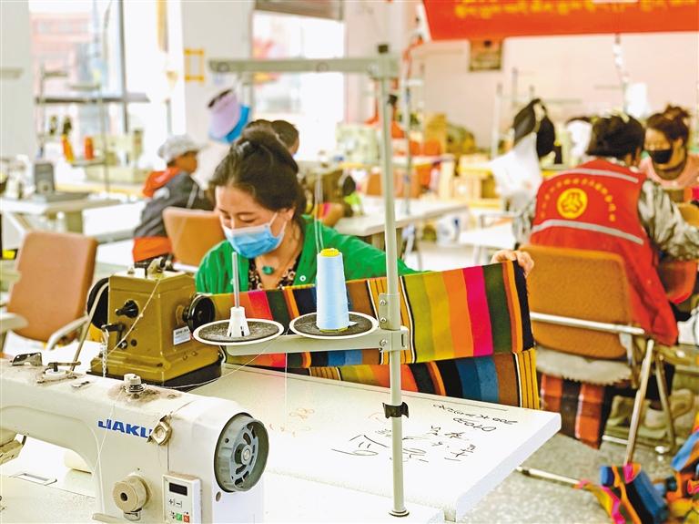 圖為(wei) 就業(ye) 群眾(zhong) 在車間裏縫製藏式服裝。記者 裴聰 攝