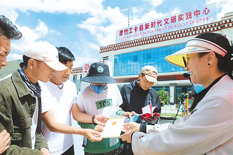 近日,墨竹工卡縣開展新時代文明實踐誌願服務活動。在活動現場,各參與(yu) 單位為(wei) 群眾(zhong) 發放宣傳(chuan) 手冊(ce) 、書(shu) 籍和雨傘(san) 、水杯等物品,向群眾(zhong) 宣傳(chuan) 講解相關(guan) 知識,還以免費理發、免費修電腦等方式為(wei) 現場群眾(zhong) 開展了送溫暖、送科技、送法律活動,進一步提高了群眾(zhong) 對各項政策的知曉度,豐(feng) 富了群眾(zhong) 的文化生活。