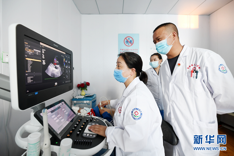 8月11日,在治多縣人民醫院,北京同仁醫院醫療專(zhuan) 家楊青苗(左一)篩查先心病患兒(er) 。新華社記者 範培珅 )