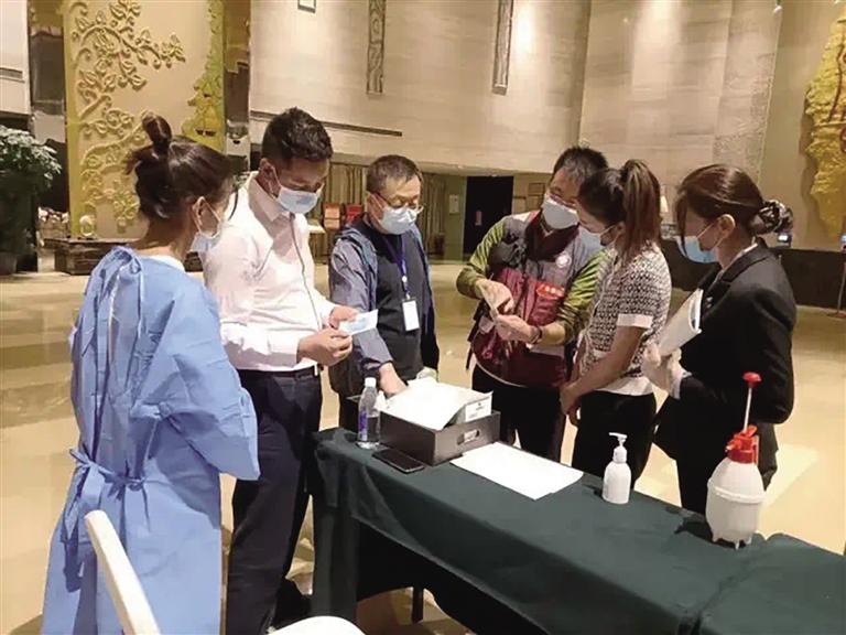 林芝市旅發局工作人員前往酒店了解滯留遊客生活保障和防疫情況。圖由林芝市旅發局提供