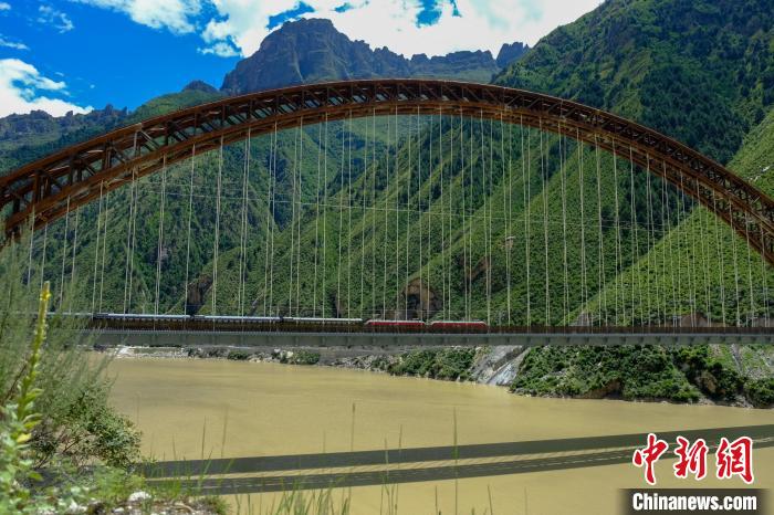圖為(wei) 一列火車經過西藏雅魯藏布江藏木大橋。 江飛波 攝