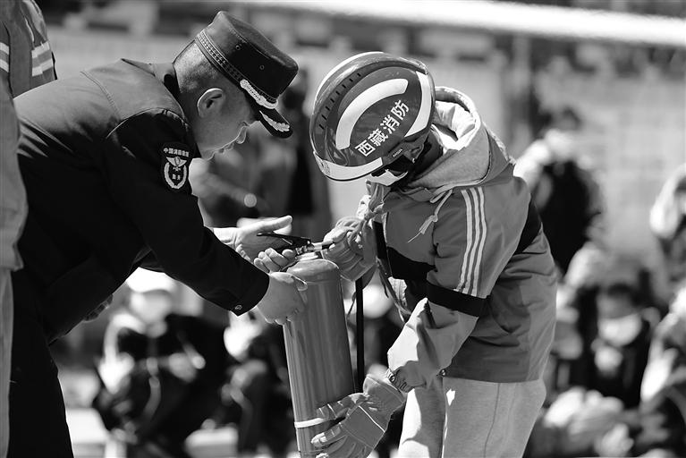 圖為(wei) 消防知識進校園活動中,消防員手把手教學生學習(xi) 使用滅火器。(圖片由山南市消防救援支隊提供)