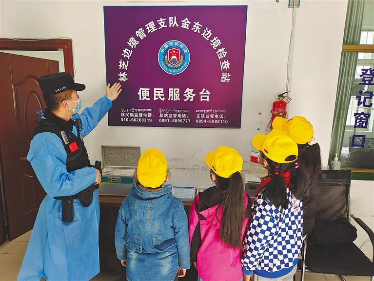 圖為(wei) 金東(dong) 邊境檢查站民警為(wei) 學生介紹便民服務台用途。記者 張猛 通訊員 揚子 攝