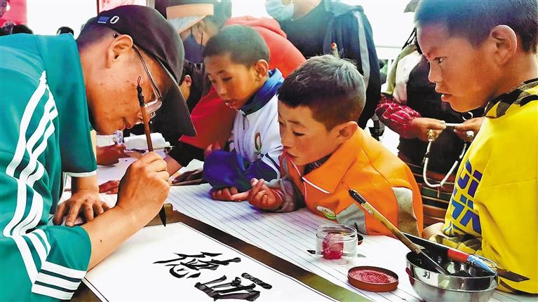 圖為(wei) 阿裏地區書(shu) 畫家進社區活動現場,為(wei) 群眾(zhong) 書(shu) 寫(xie) 紮西德勒。通訊員 唐磊 攝