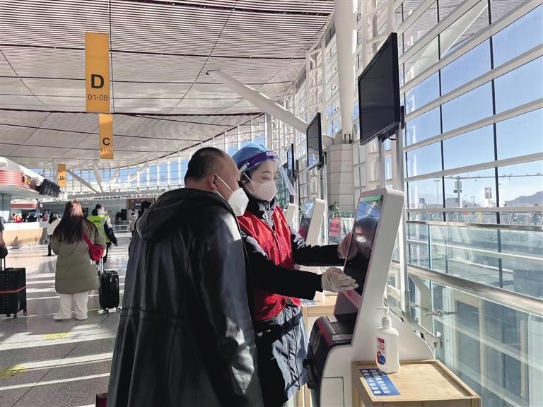 誌願者在自助值機區域協助旅客辦理手續。圖由民航西藏管理局提供