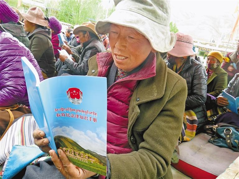 圖為(wei) 村民認真學習(xi) 《農(nong) 牧民法律知識手冊(ce) 》。記者 巴桑旺姆 攝