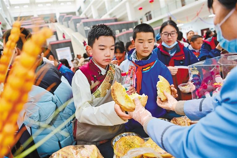 圖為(wei) 2月21日,在西安市滻灞第一中學舉(ju) 行的藏曆新年團拜活動上,漢藏學生品嚐特色小吃。新華社記者 李一博 攝