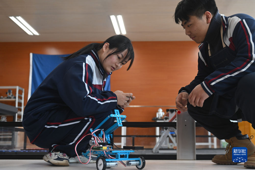 2月23日,西寧果洛中學學生在機器人教室內(nei) 操作自己組裝的機器人。新華社記者 張龍 攝