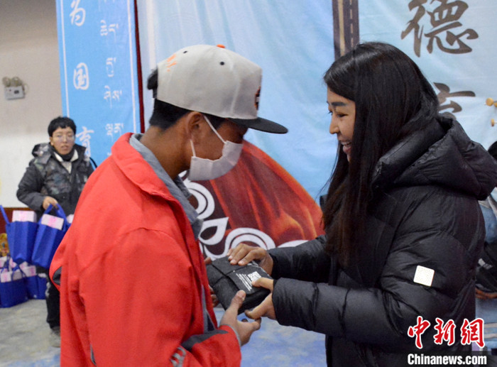 2021年,西藏那曲公益捐贈活動中,德慶玉珍(右)為(wei) 青少年兒(er) 童送上成長愛心包。(資料圖片) 受訪者 供圖