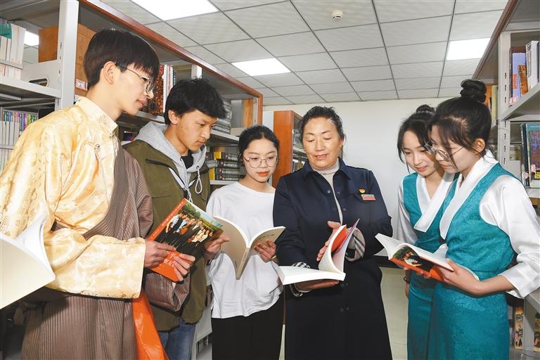 圖為(wei) 在西藏大學圖書(shu) 館,央宗老師和學生分享《習(xi) 近平與(yu) 大學生朋友們(men) 》一書(shu) 。記者 李洲 攝