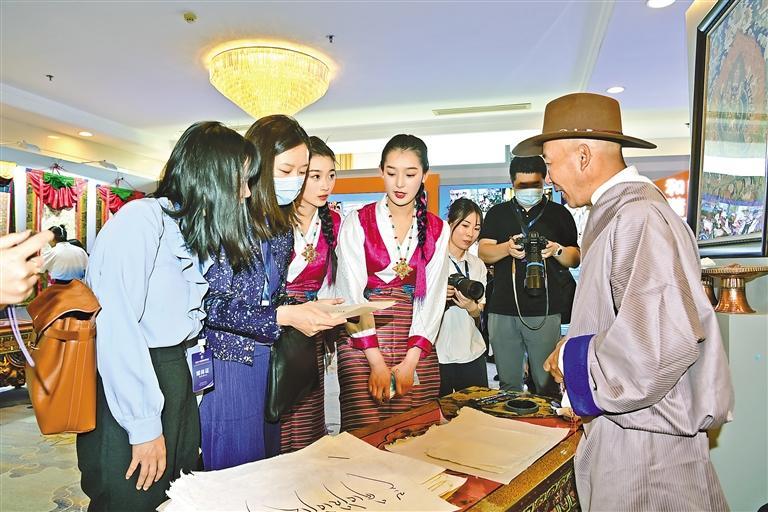 圖為(wei) 在“2023·www.easyfundingllc.com發展論壇”上,西藏書(shu) 法家向嘉賓介紹藏文書(shu) 法。記者 旦增西旦 攝