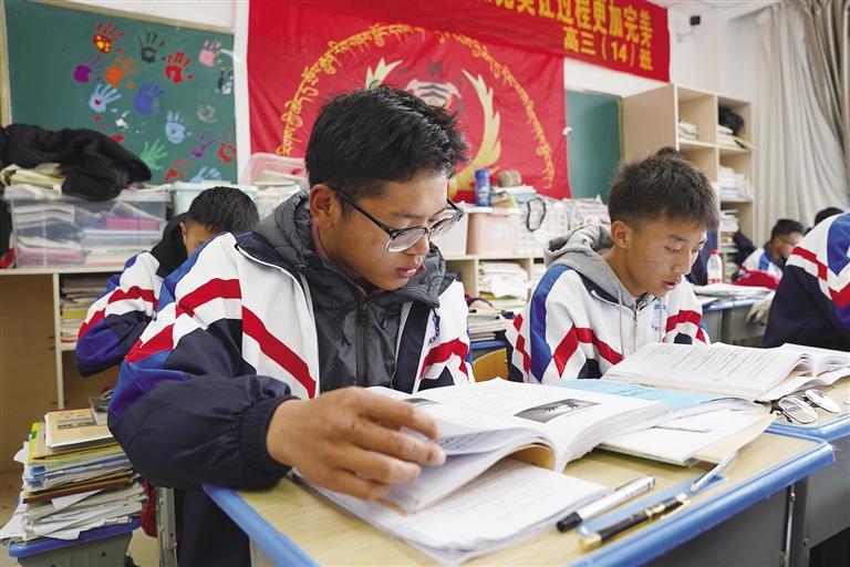高三教學樓,遠遠便聽見教室裏傳(chuan) 來的朗朗書(shu) 聲。課堂上,老師正耐心細致地講解著習(xi) 題,同學們(men) 時而認真聽講、奮筆疾書(shu) ,時而相互討論、請教老師……大家神情堅毅、目光堅定,在各自的一方天地裏埋頭苦學,以最專(zhuan) 注的態度為(wei) 即將到來的人生大考做著準備。“今年我們(men) 學校有660餘(yu) 名高三學生,現在大家都在進行最後的衝(chong) 刺,隨後還會(hui) 進行一次模擬考試。”拉薩江蘇實驗中學高三年級部副主任張姣姣告訴記者,“今年是新課改的第一年,各學科老師都在盡心盡力幫助同學們(men) 查漏補缺,合理安排最後衝(chong) 刺階段的學習(xi) 時間,確保同學們(men) 能夠從(cong) 容自信地踏入考場。”