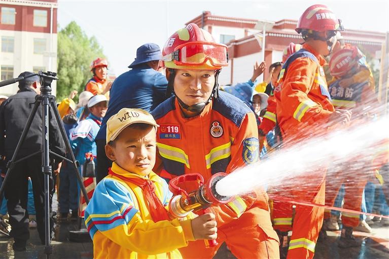 日喀則市小學學生體(ti) 驗滅火救援器材。