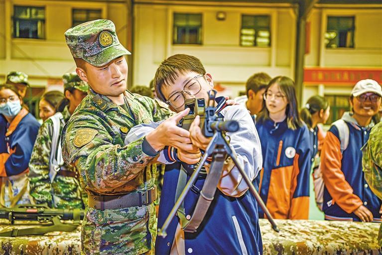 追憶崢嶸歲月,堅定鏗鏘步伐。榮譽室內(nei) ,一幅幅照片、一行行文字、一件件實物,直擊師生心靈。在講解員的娓娓道來中,師生感受著先輩們(men) 頑強拚搏、百折不撓的革命精神。體(ti) 驗武器裝備時,解說員的細心講解和嫻熟操作,讓學生對武器裝備有了更加直觀的印象。不少學生在官兵的指導下“零距離”接觸武器裝備,真實體(ti) 驗“手握鋼槍”的現實感。此次活動進一步促進了軍(jun) 地交流,加深了軍(jun) 民關(guan) 係,為(wei) 現場師生上了一堂生動的國防教育課。