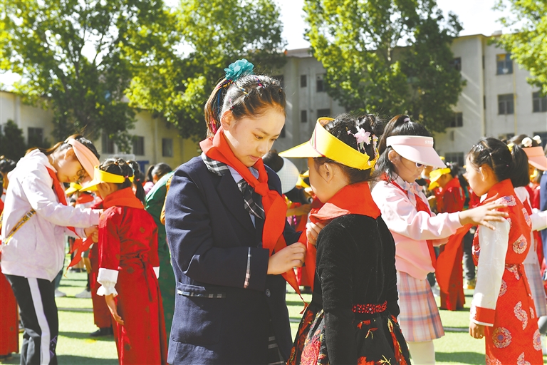 拉薩市第三小學少先隊老隊員為(wei) 新入隊隊員係紅領巾。記者 次仁平措 攝
