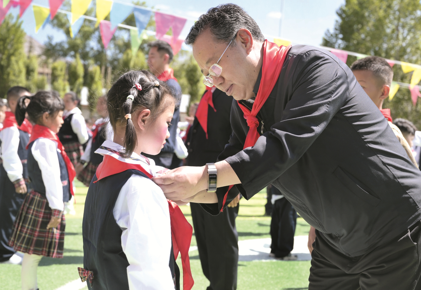 6月1日,西藏自治區黨(dang) 委常委、市委書(shu) 記普布頓珠來到市實驗小學、實驗幼兒(er) 園走訪慰問。這是普布頓珠在市實驗小學為(wei) 少先隊新隊員授紅領巾。拉薩融媒記者 貢覺群培攝