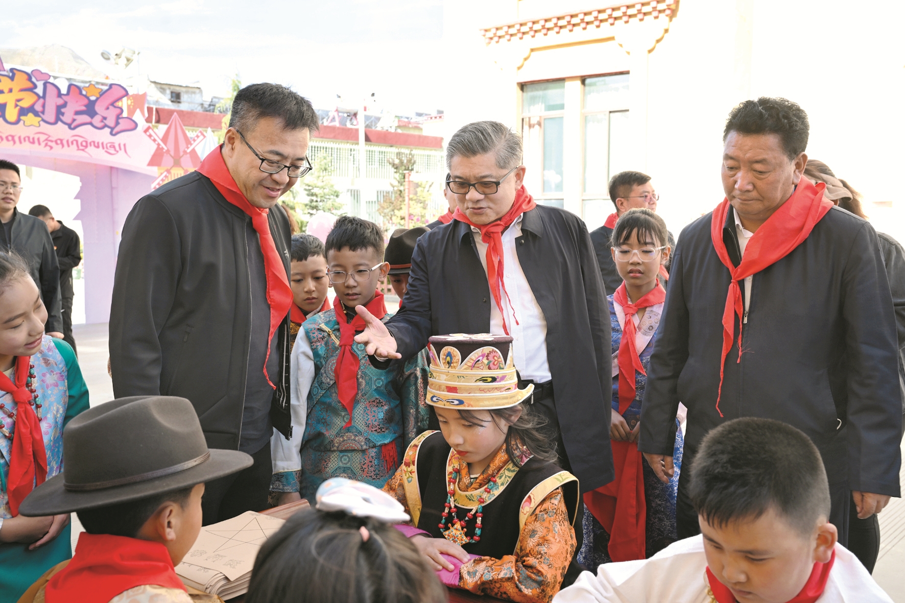 拉薩市第一小學是西藏和平解放後拉薩開辦的第一所公立小學,建校70年來,為(wei) 新西藏各項建設事業(ye) 輸送了萬(wan) 千棟梁人才。來到拉薩市第一小學江蘇路分校,身著民族服飾的藏族小姑娘南傑拉措為(wei) 王強一行係上鮮豔的紅領巾,並熱情帶領王強一行走向校園。